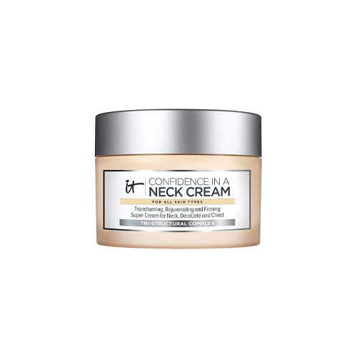 La crema para el cuello Confidence in A Neck Cream de IT Cosmetics es una innovadora crema hidratante diseñada para transformar la apariencia del cuello, el escote y el pecho. Clínicamente probada para reducir la apariencia de las líneas del cuello y mejorar la firmeza, suavidad y elasticidad de la piel, esta crema proporciona resultados visibles con el tiempo. Enriquecida con ingredientes antienvejecimiento como extracto de algas marinas de fucoidano, manteca de karité y un complejo triestructural de elastina, colágeno y ácido hialurónico, esta crema revitaliza al instante el aspecto de la piel para una apariencia más flexible y suave.